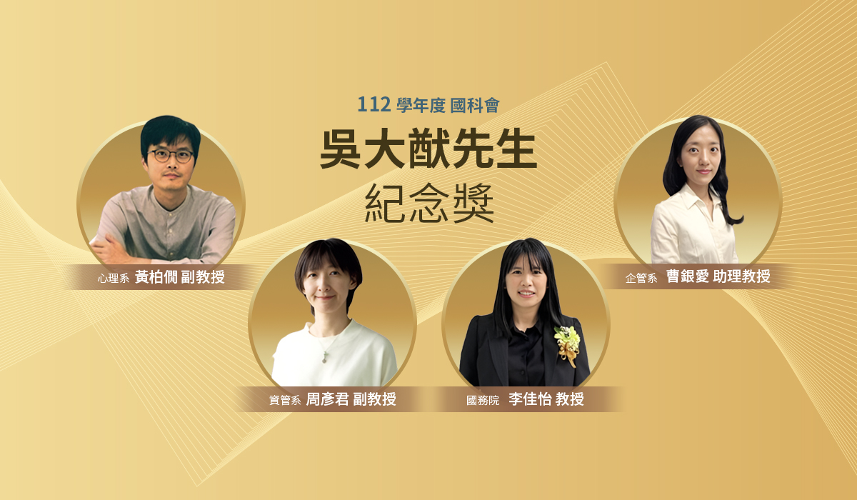國科會日前公布112年度「吳大猷先生紀念獎」得獎名單,本校今年得獎人數再創新高,四位得獎者分別為心理系副教授黃柏僩、企管系助理教授曹銀愛、資管系副教授周彥君及國務院教授李佳怡。