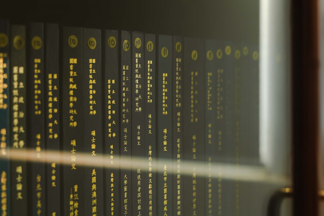 - 陳志銘的圖書資訊與檔案學研究所所長辦公室陳列歷屆學生論文,顯現強大的研究能量。(攝影:許芷婕)