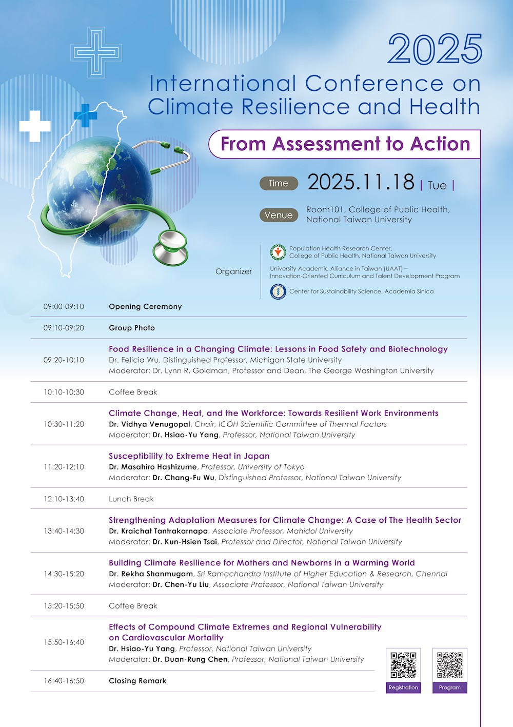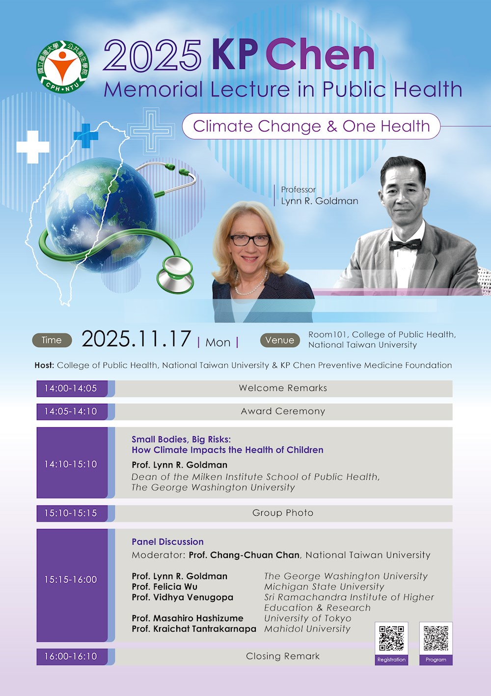 說明: 一、旨揭研討會由本校公共衛生學院與陳拱北預防醫學基金會共同主辦,本屆主題為「Climate Change & One Health」。歷屆講座獲獎者均為當代對公共衛生做出重要且獨特貢獻的傑出國際人士,本屆獲獎者為美國喬治華盛頓大學米爾肯學院公共衛生學院院長Lynn R. Goldman教授。Goldman教授將至臺大公衛學院進行演講。為增加講座的豐富度,將於隔日舉辦「氣候韌性與健康國際研討會International Conference on Climate Resilience and Health: From Assessment to Action」,邀請國內外專家至本校公衛學院演講。 二、研討會資訊如下: (一)時間:114年11月17日(星期一)14時至16時;11月18日9時至16時50分。 (二)地點:本校公共衛生學院大樓101講堂(臺北市中正區徐州路17號)。 (三)活動網頁:https://coph.ntu.edu.tw/web/news/news_in.jsp?np_id=NP1759976642241&dm_id=DM1649820572124。 (四)報名網址:https://forms.gle/m4kF1HwwBfgekK1w9。 (五)本次研討會全程以英文方式進行。 (六)主辦單位:本校公共衛生學院、陳拱北預防醫學基金會、國家重點領域國際合作聯盟--創新課程與人才培育計畫與中研院永續科學中心。 三、全程參加會議並完成簽到退者,提供出席證明或「公務人員終身學習」時數。 四、報名後如不克出席,請來信或致電告知。 五、如有相關問題,請洽詢本校公共衛生學院環職所(電話:02-33668112,電子郵件:ntueohs@ntu.edu.tw)。
