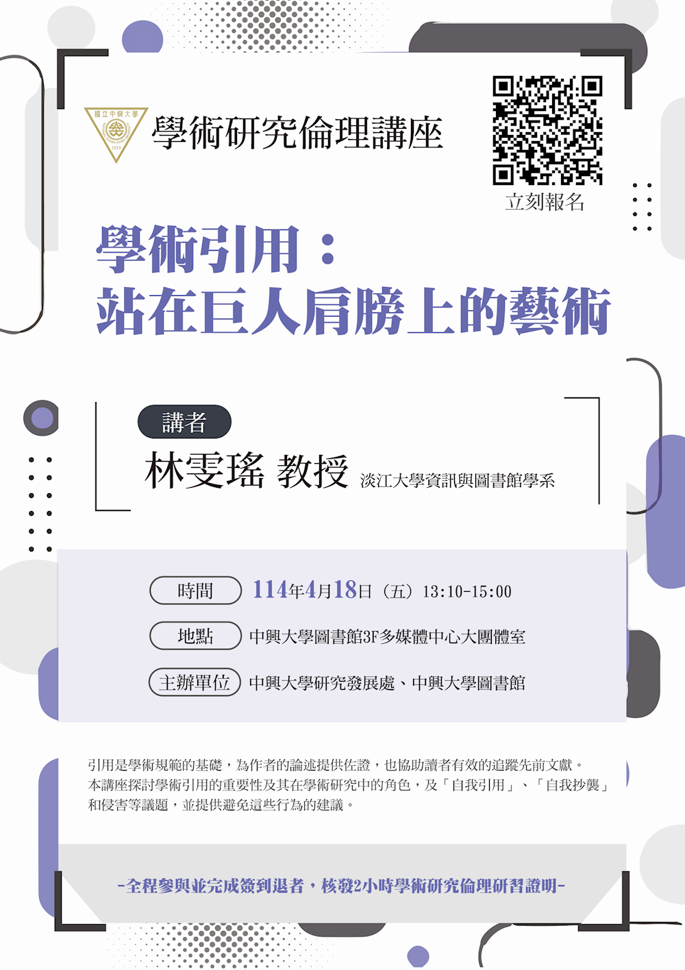 國立中興大學將於114年4月18日舉辦「學術引用:站在巨人肩膀上的藝術」學術研究倫理講座(實體)
